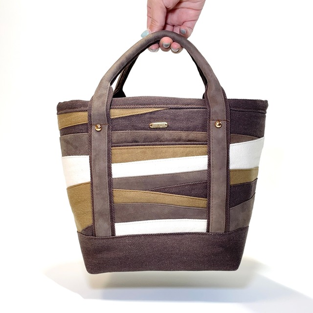 ブラウンデニムと本革スエードを組み合わせた、小さめサイズのトートバッグです。 落ち着いた深みのあるブラウンに、柔らかなスエードの質感をプラス。 カジュアルながら上品さもあり、普段のおでかけから少しきれいめなコーデまで幅広く使えます。 サイズ 縦:19.5cm 横:29cm マチ:12cm (内ポケット付き) 小ぶりに見えてしっかり収納できるバランスのいいサイズ感。 一点ずつ丁寧に仕上げているので、永く愛用していただけます。 A compact tote bag crafted from brown denim and genuine suede leather. Its deep brown color and soft leather texture create a casual yet refined look— easy to style for everyday outings or slightly dressier outfits. Size Height: 19.5cm Width: 29cm Depth: 12cm (With inner pocket) Small in appearance but surprisingly spacious, this tote offers a comfortable balance between style and practicality. Each piece is carefully handcrafted to be enjoyed for years to come.