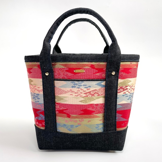 着物帯とデニムを組み合わせて作った、小さめサイズのトートバッグです。 上質な帯ならではの光沢と織りの美しさをそのまま生かし、デニムと合わせることで、華やかさと普段使いしやすさを両立させました。 サイズ 縦約:19.5cm 横約:29cm マチ約:12cm (内ポケット付き) 小ぶりながら収納力があり、ちょっとしたおでかけにも日常使いにも便利。 一点一点手作業で制作しているため、同じ柄の出方はなく、唯一のデザインを楽しめます。