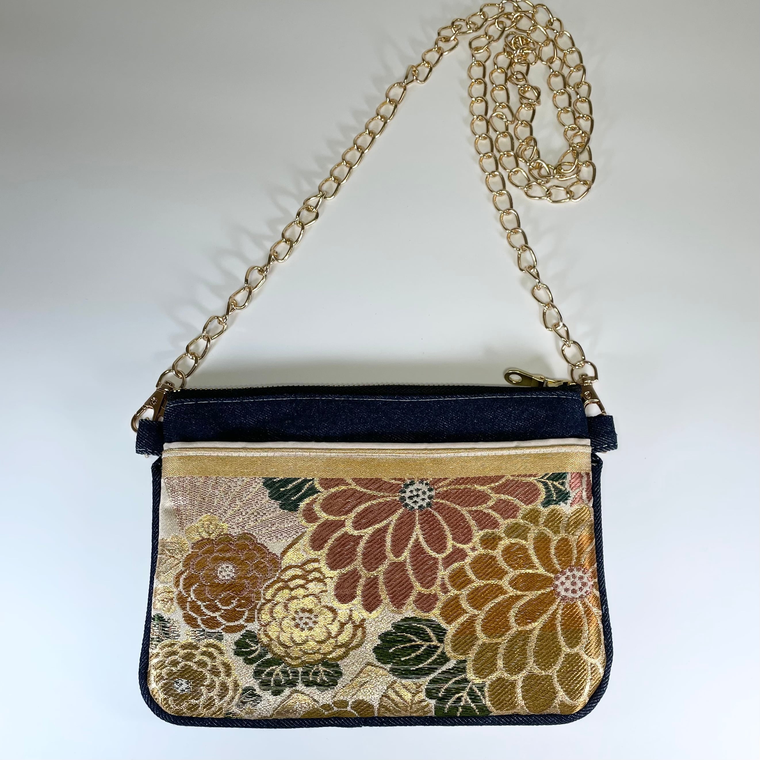 着物生地とデニムを組み合わせた、和モダンな雰囲気のミニショルダー。