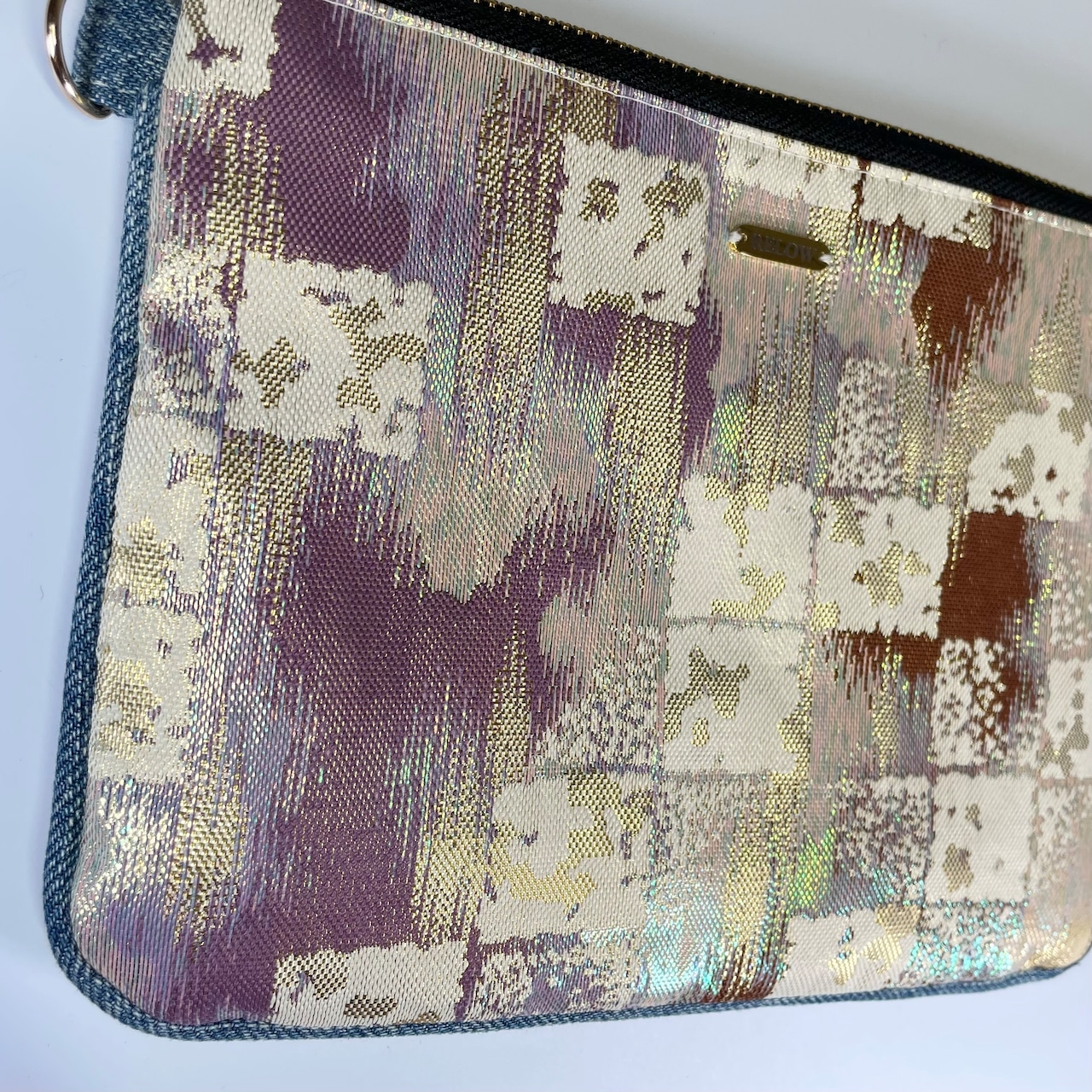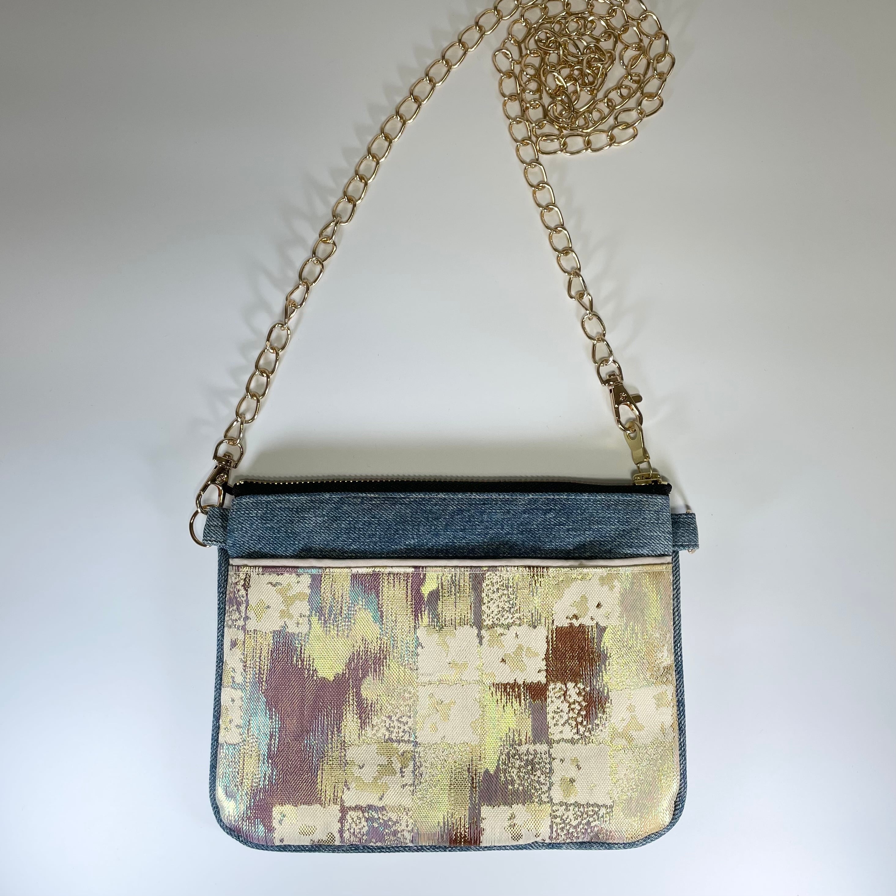 A compact 2-way mini bag that blends traditional kimono fabric with casual denim for a modern Japanese look.