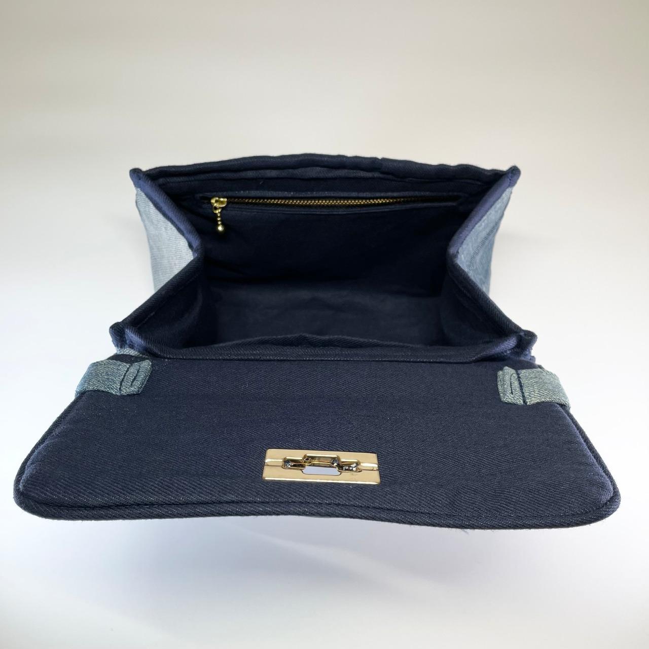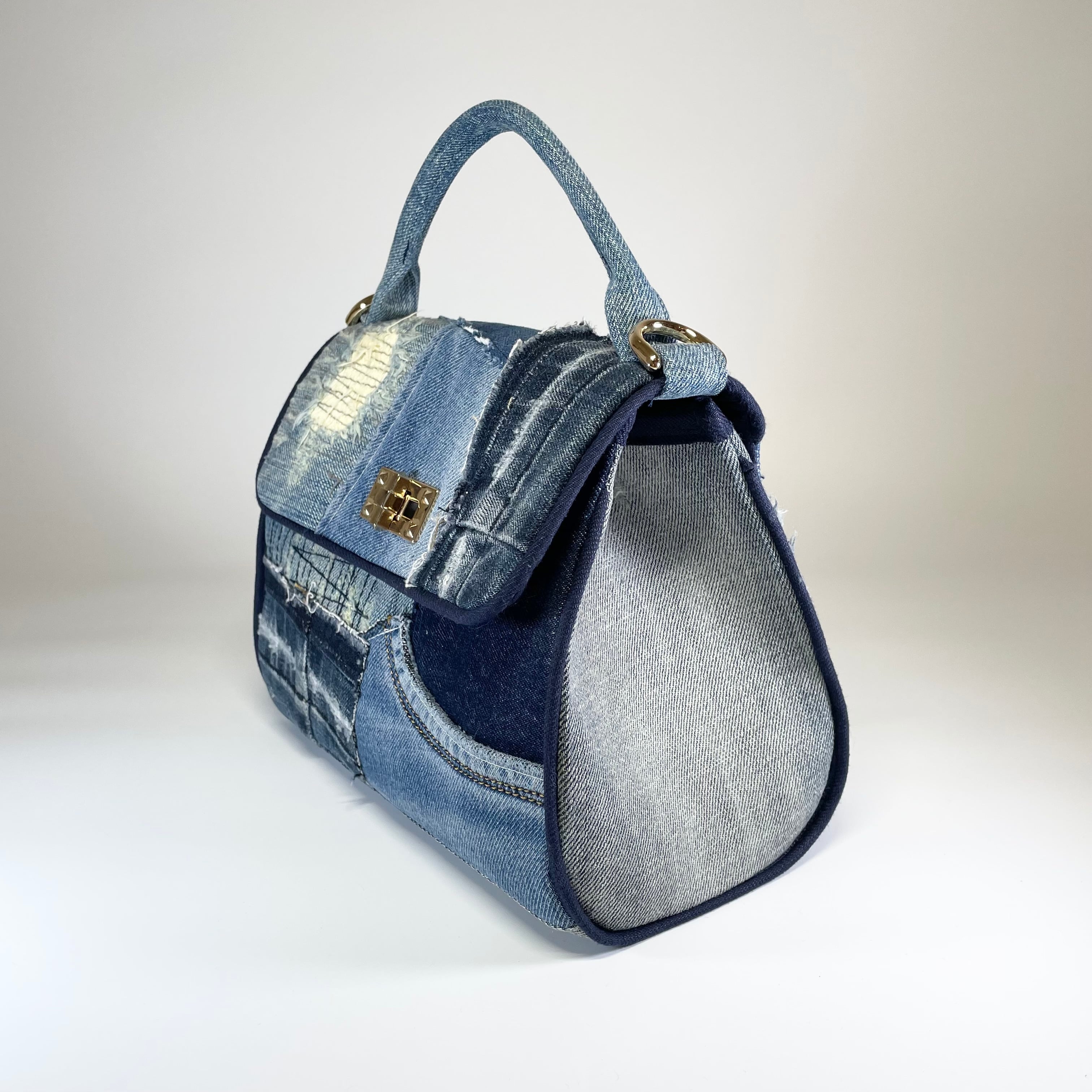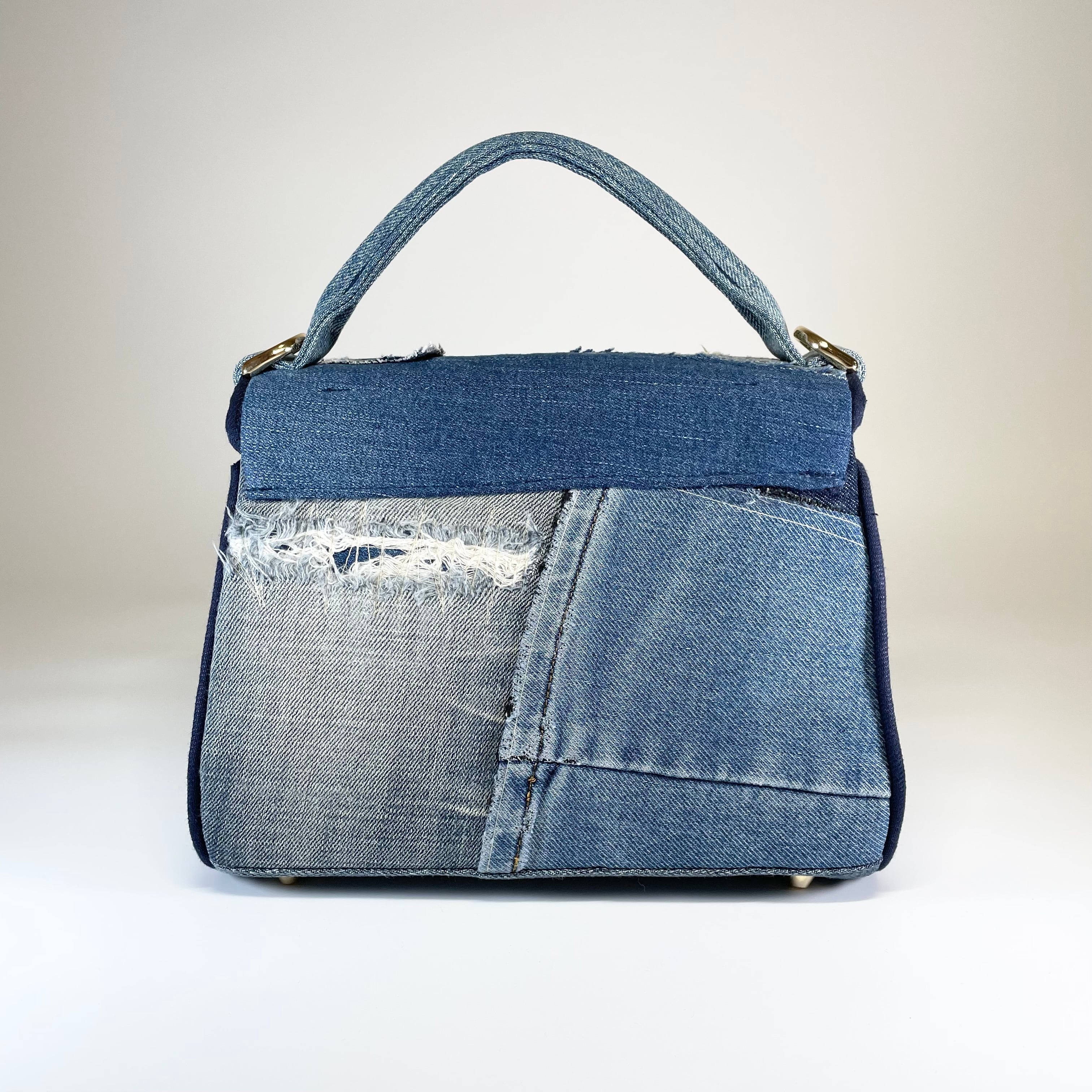 This handle bag is crafted entirely from denim, using carefully arranged denim offcuts in a unique patchwork design.