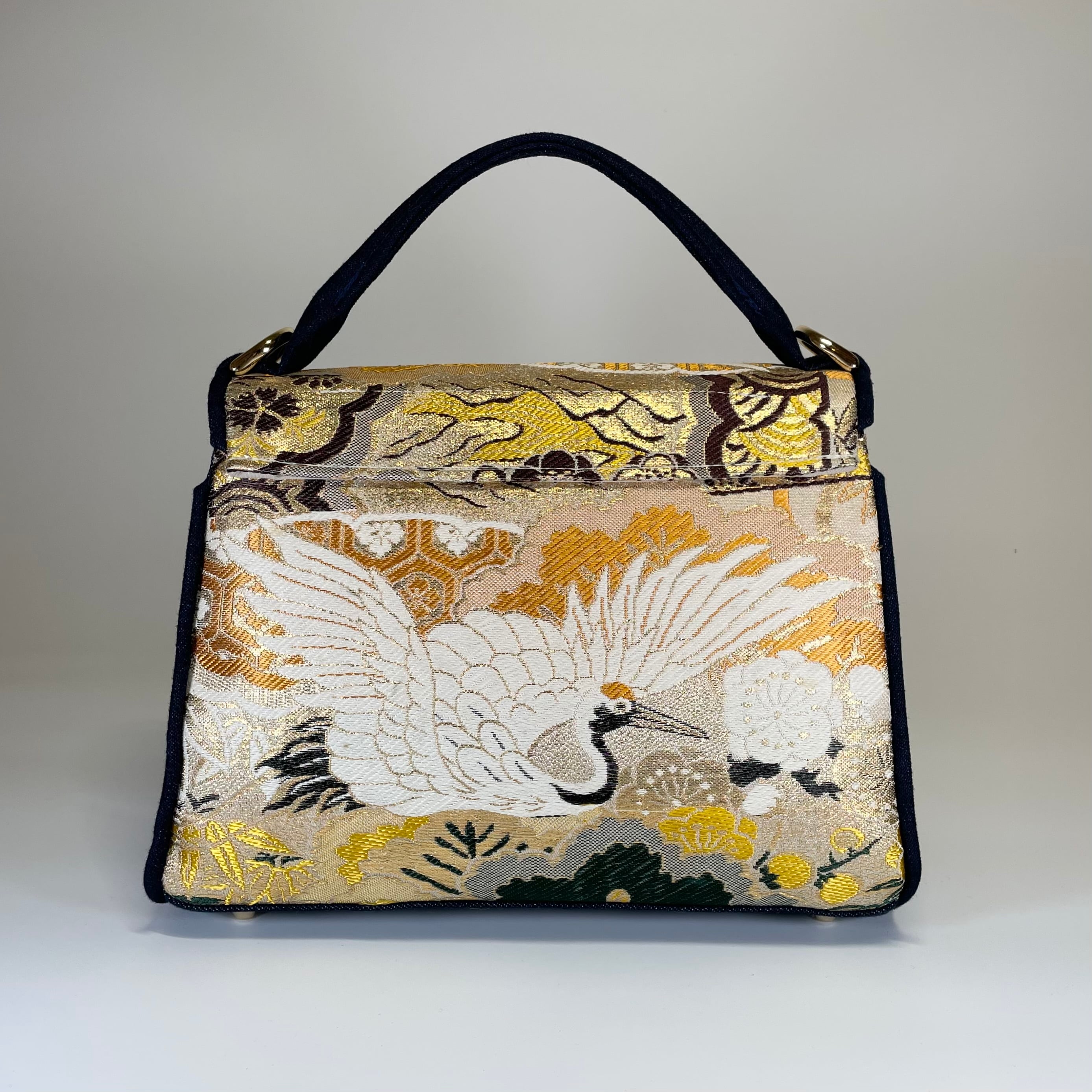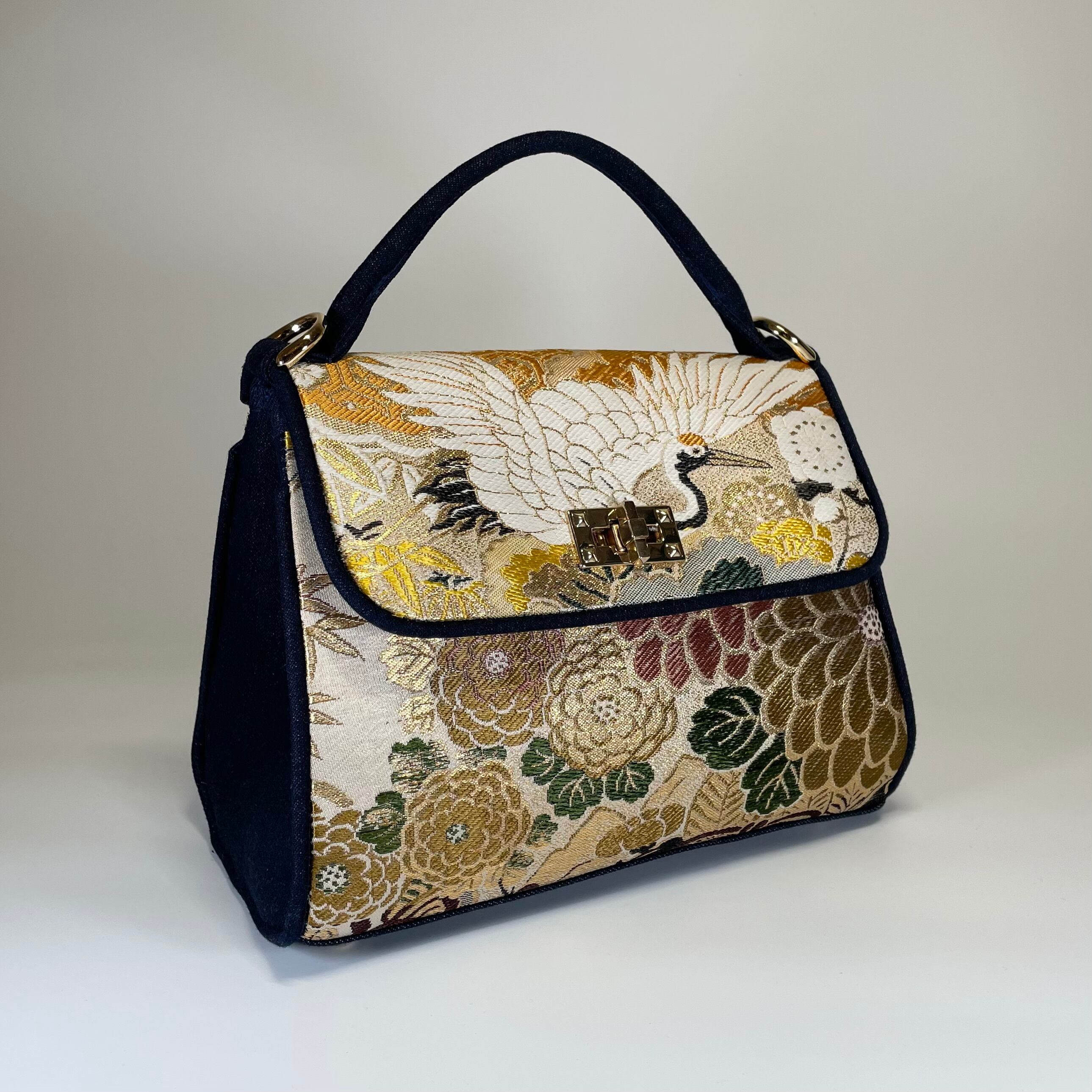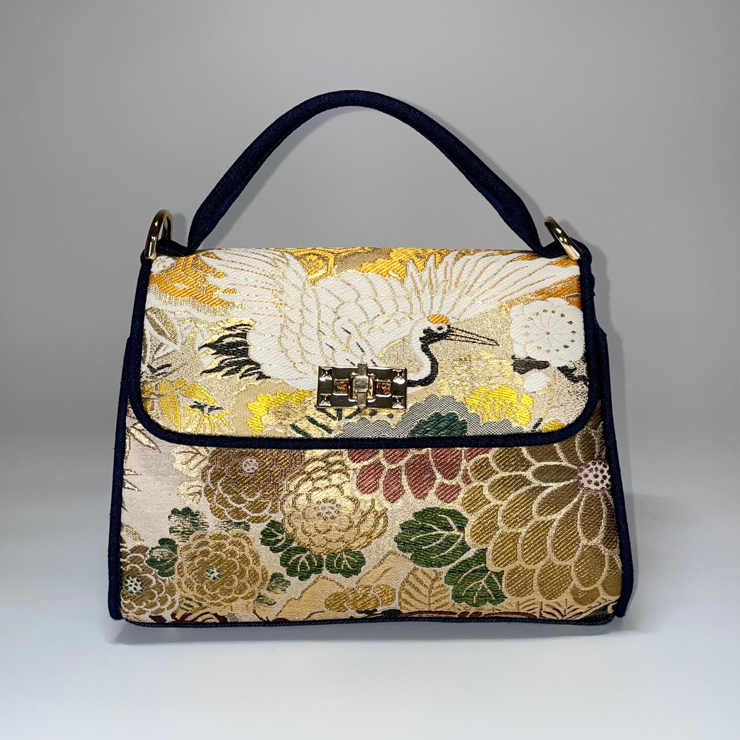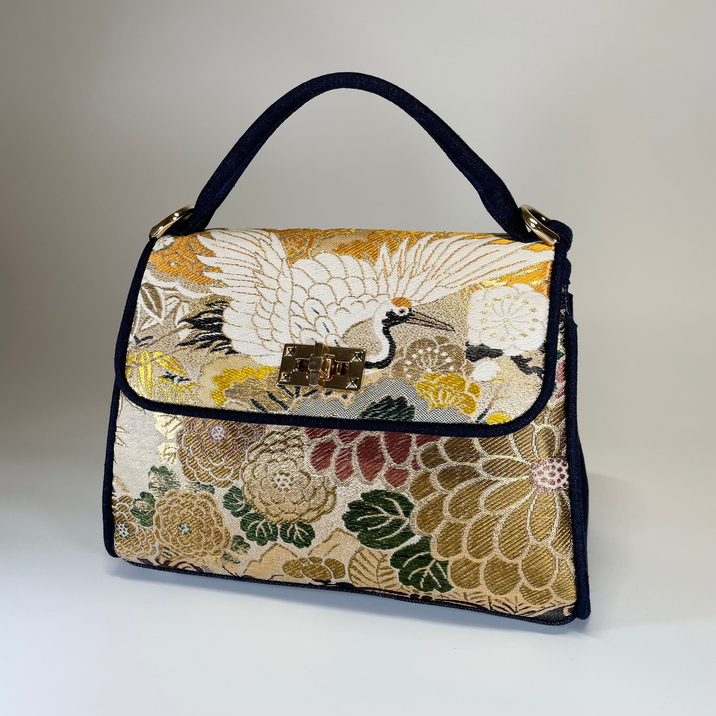 A stunning handbag crafted from a vintage kimono obi (sash), featuring an elegant crane and chrysanthemum pattern woven with shimmering gold threads.