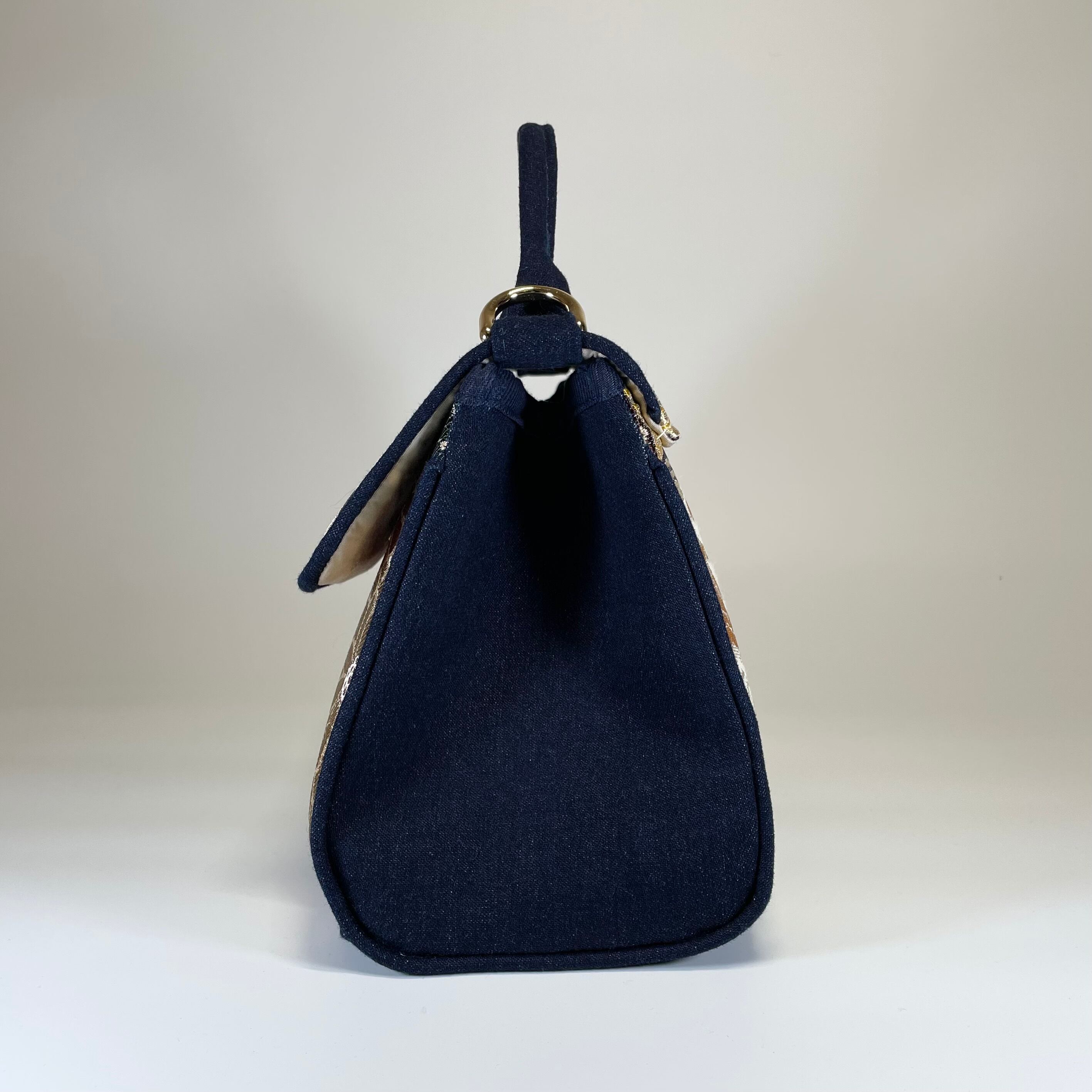 ハンドル部分や縁にはデニムを使用し、伝統とモダンを融合。
