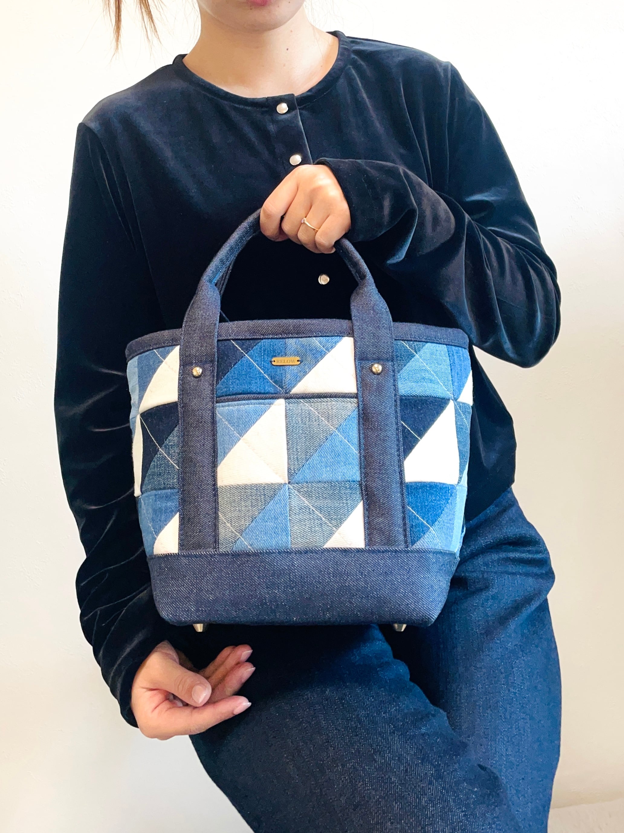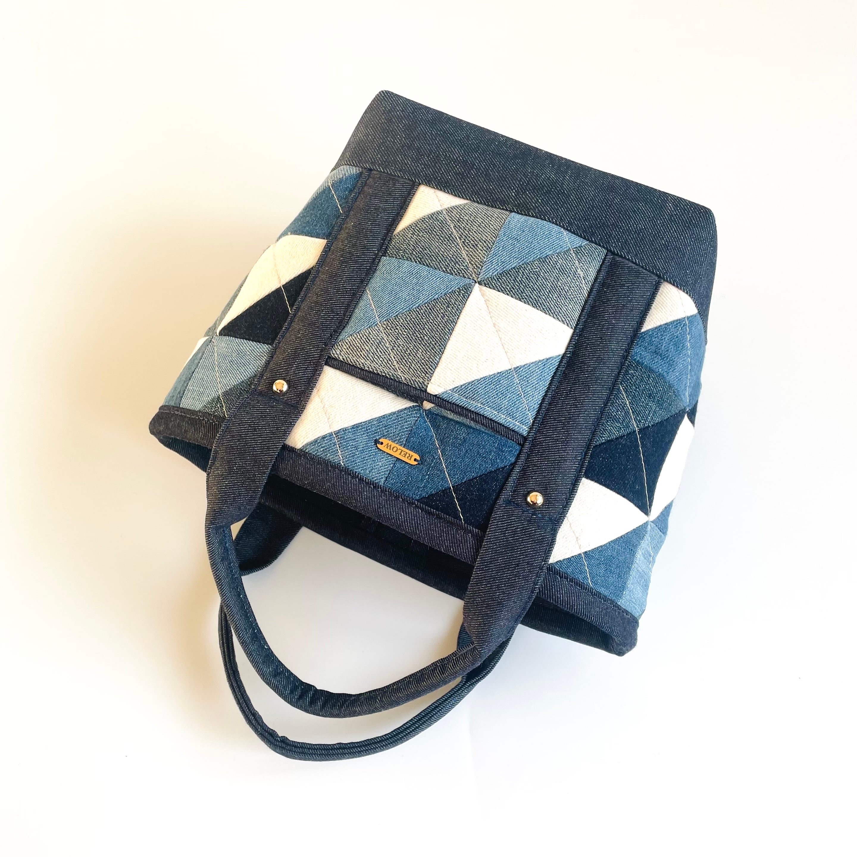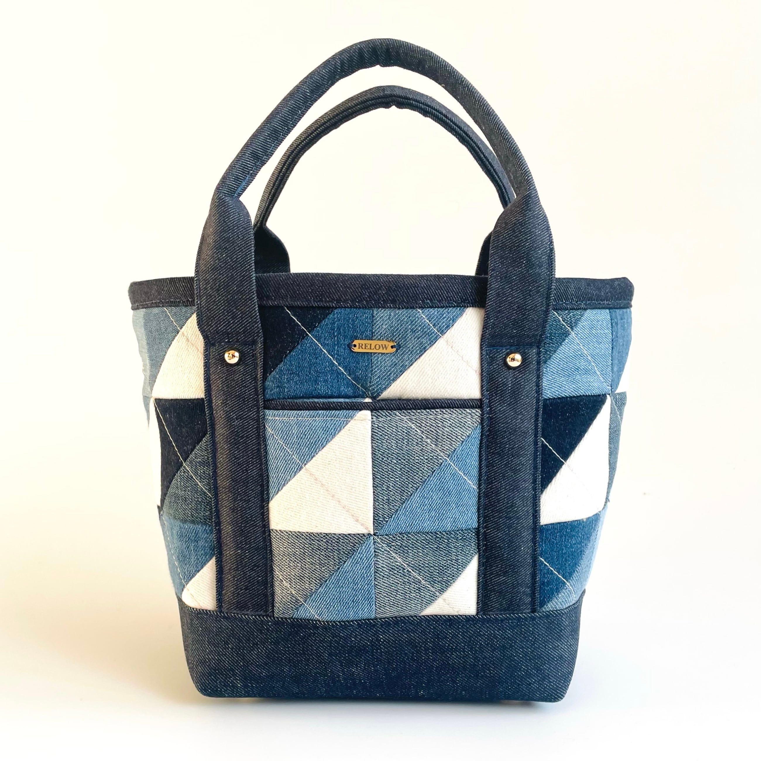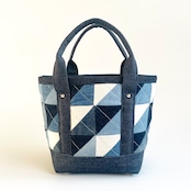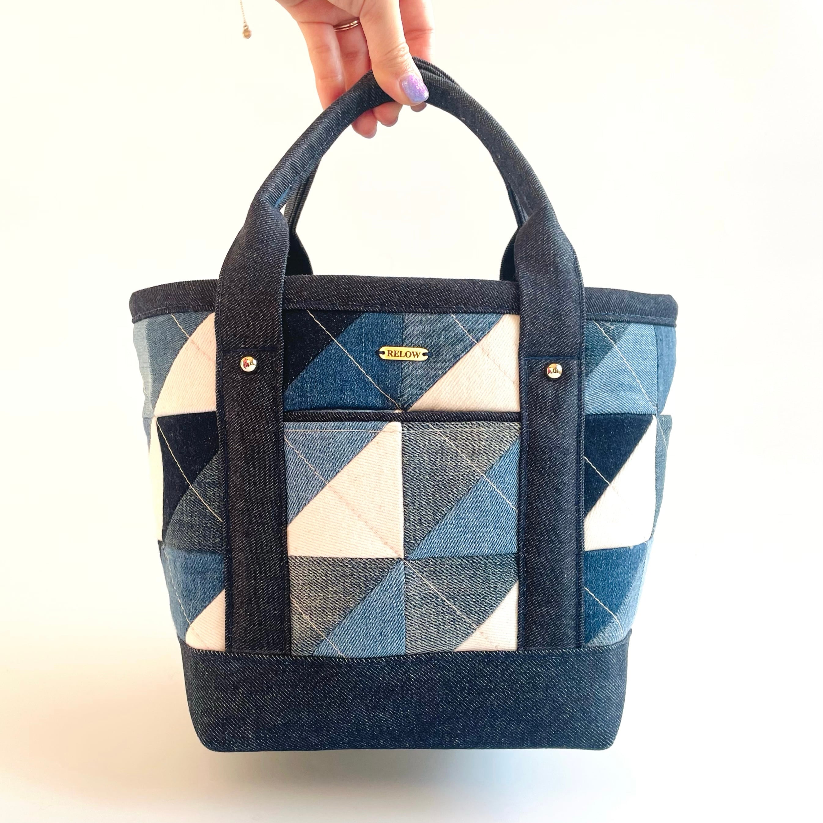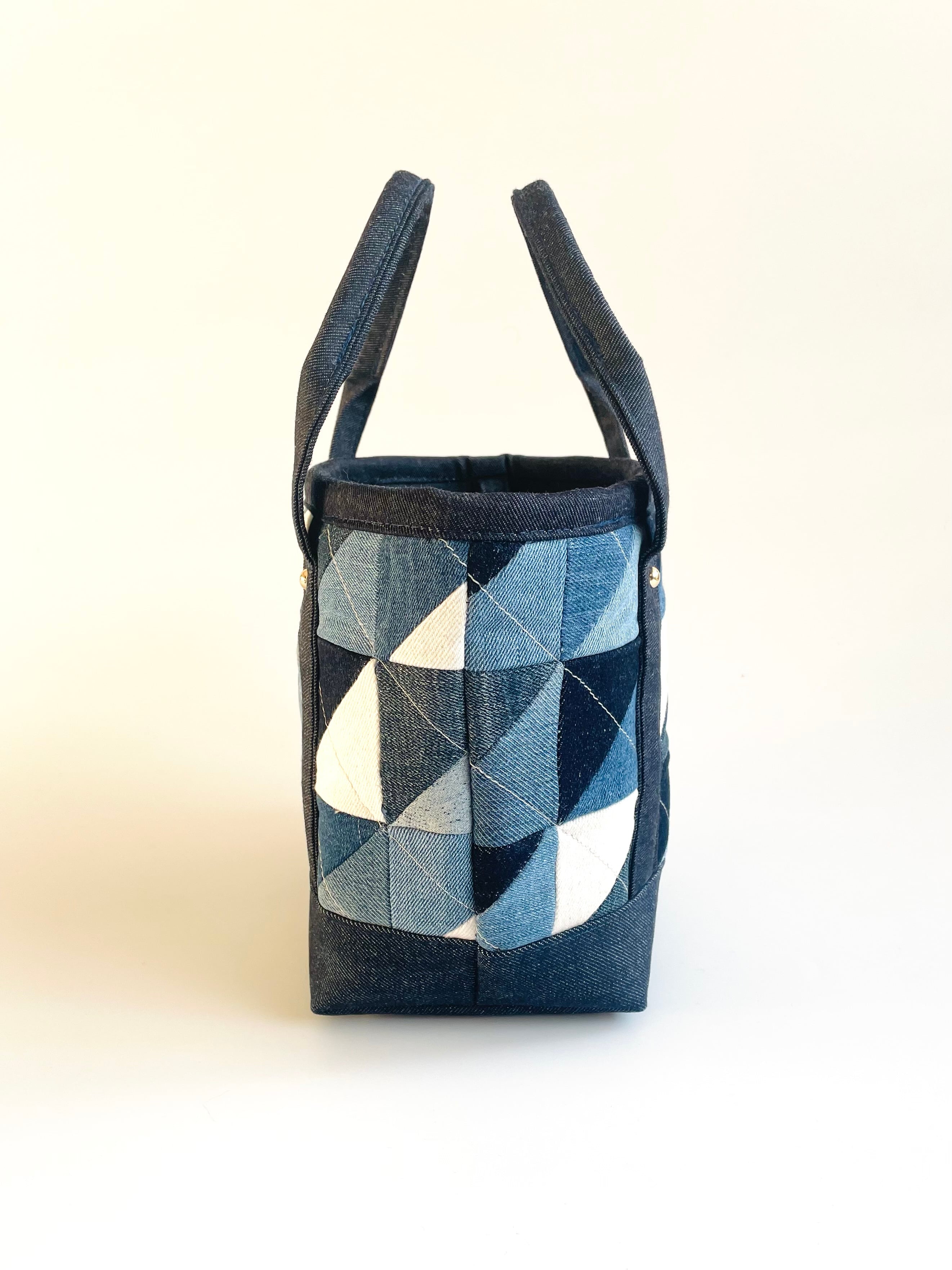 This mini tote features rhythmic lines created by patchworking denim in varying shades.