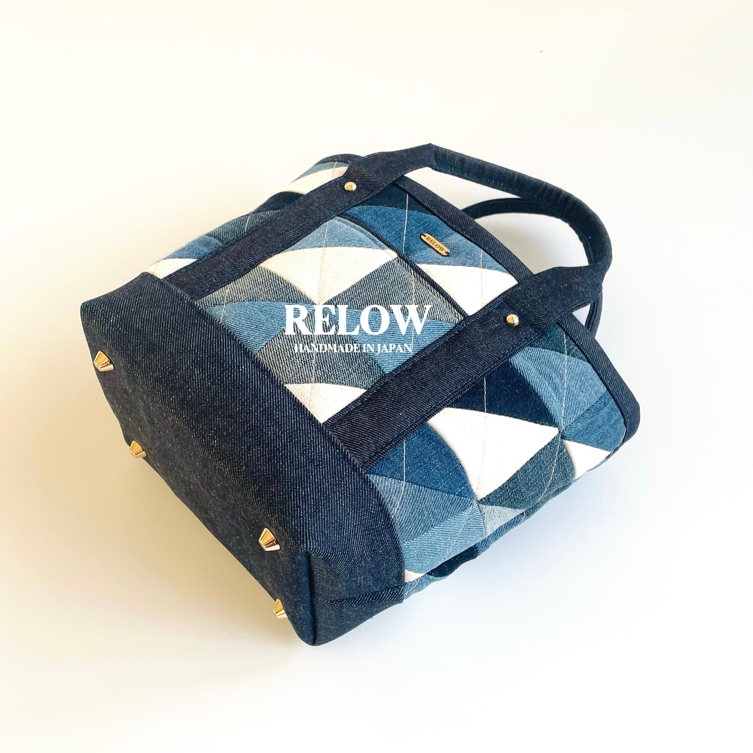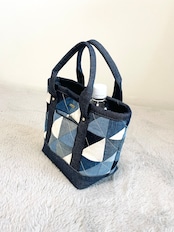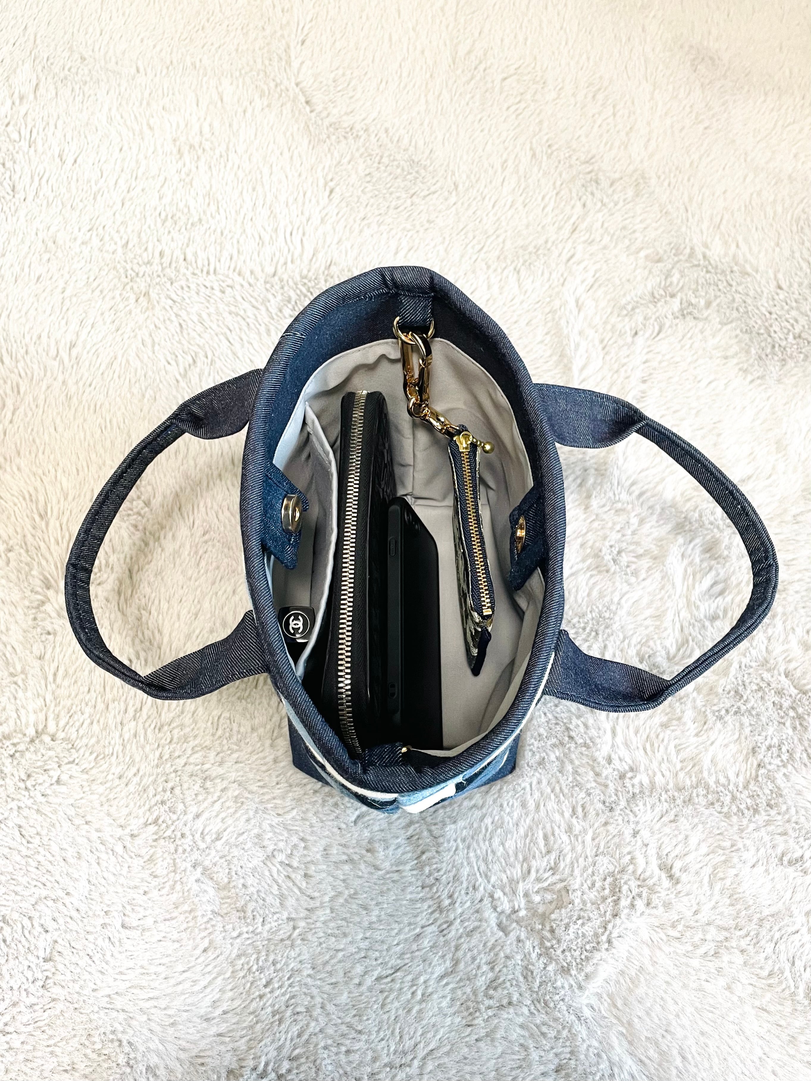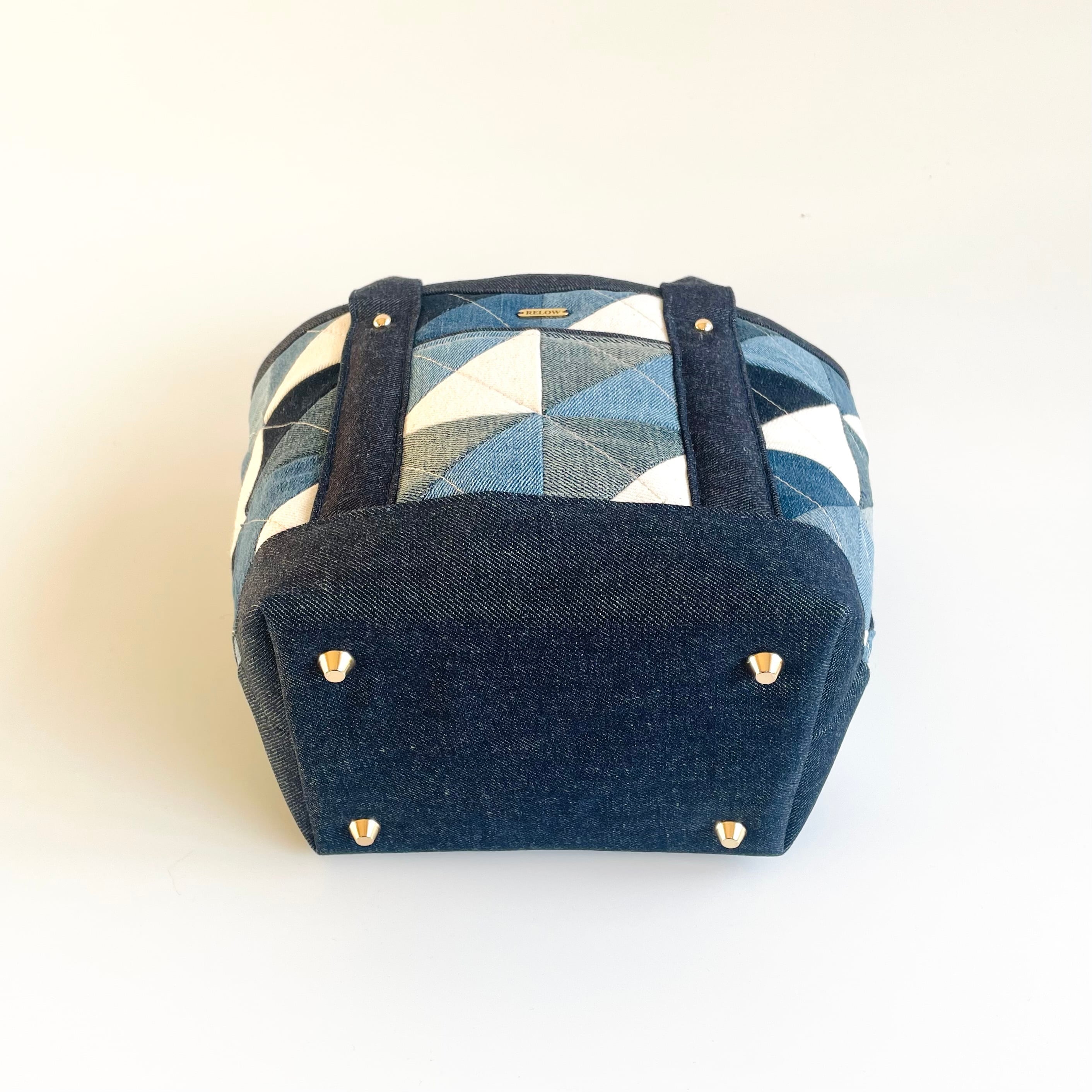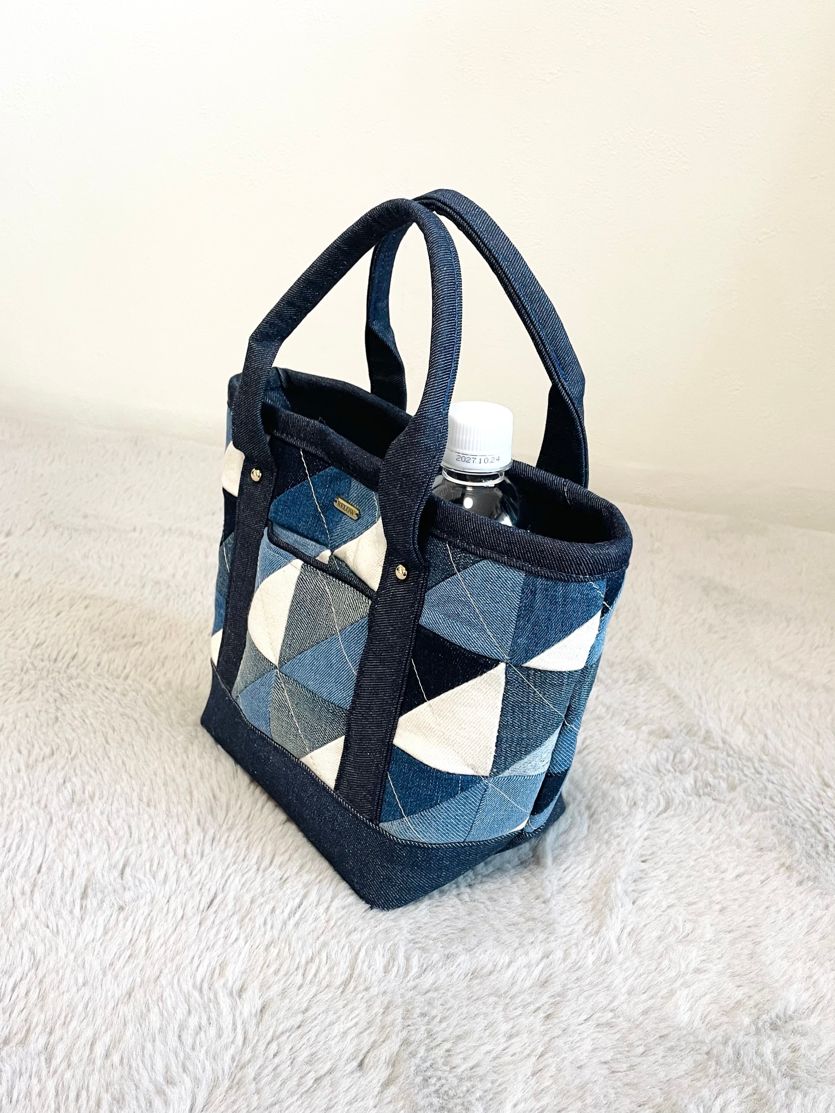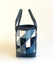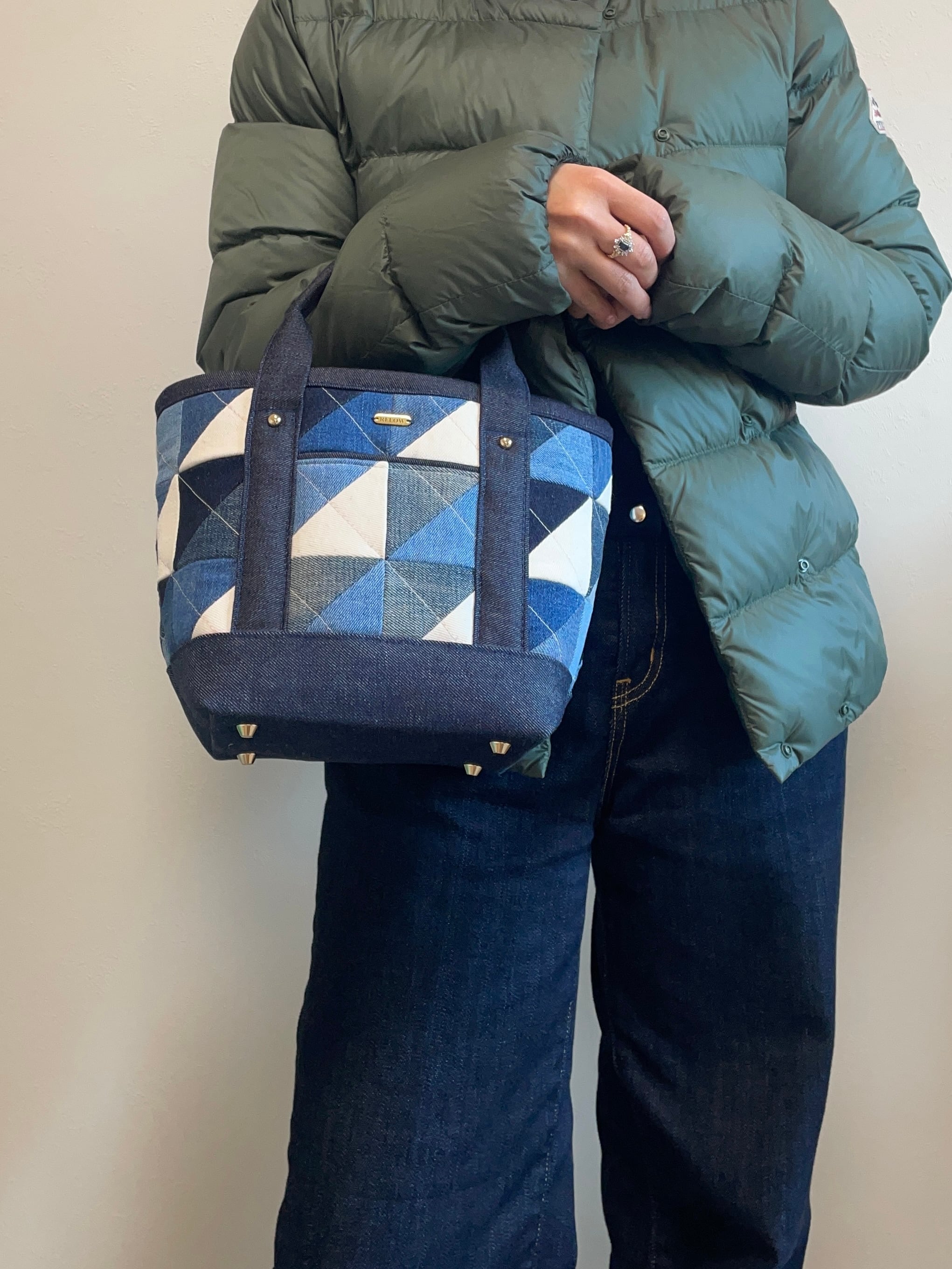 This mini tote features rhythmic lines created by patchworking denim in varying shades.