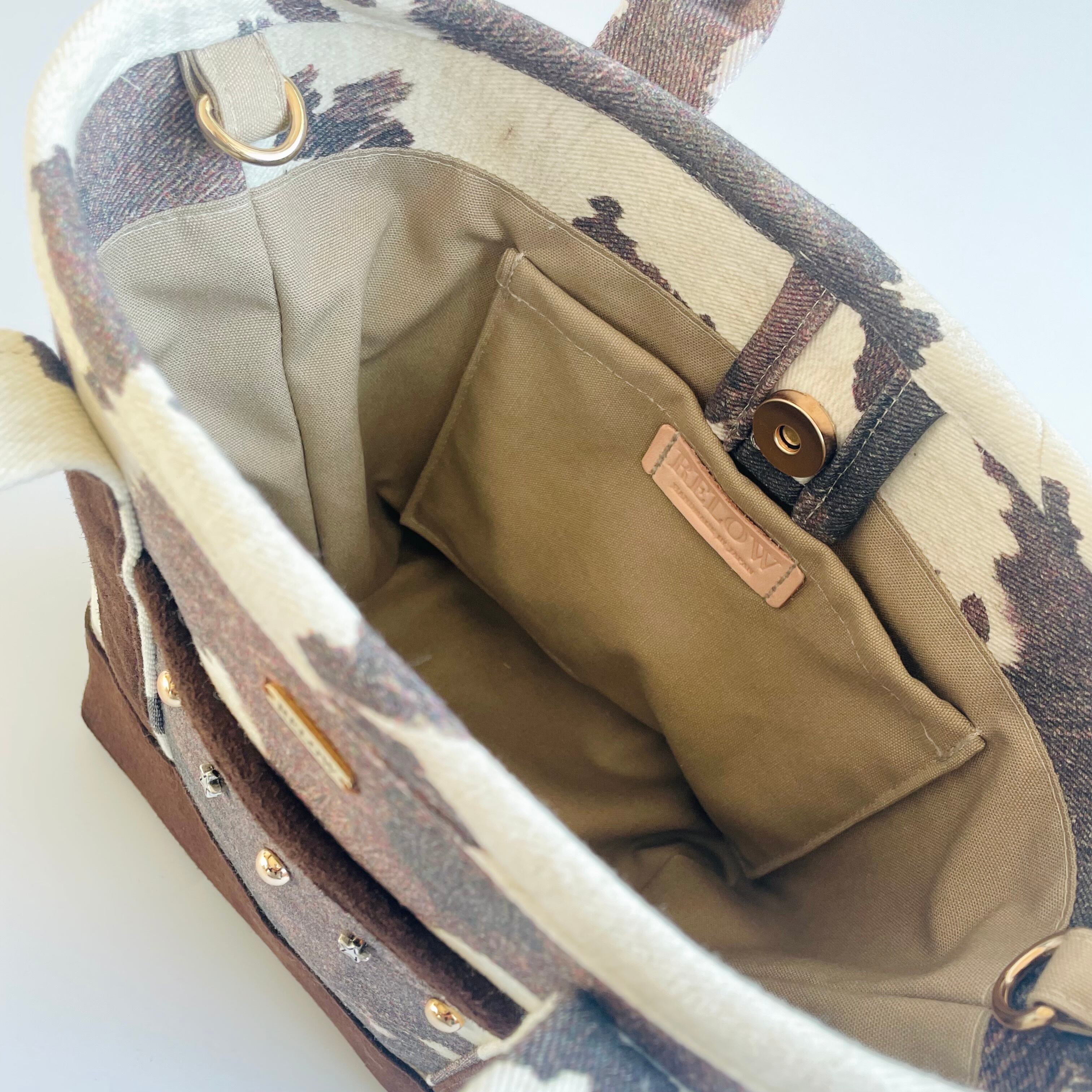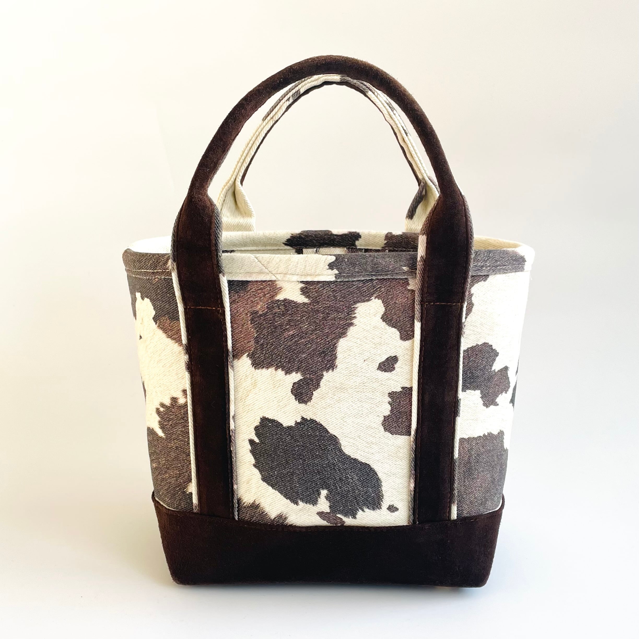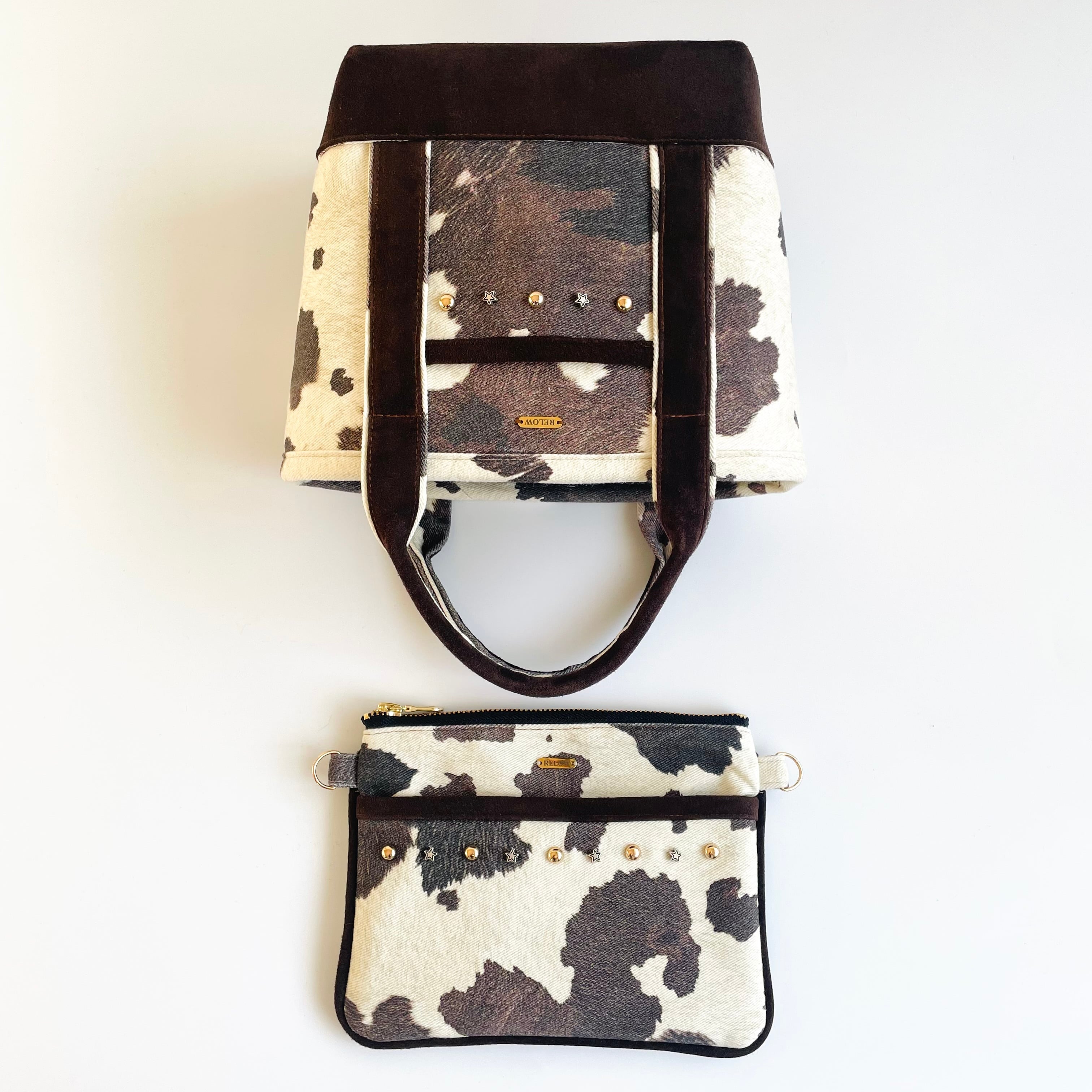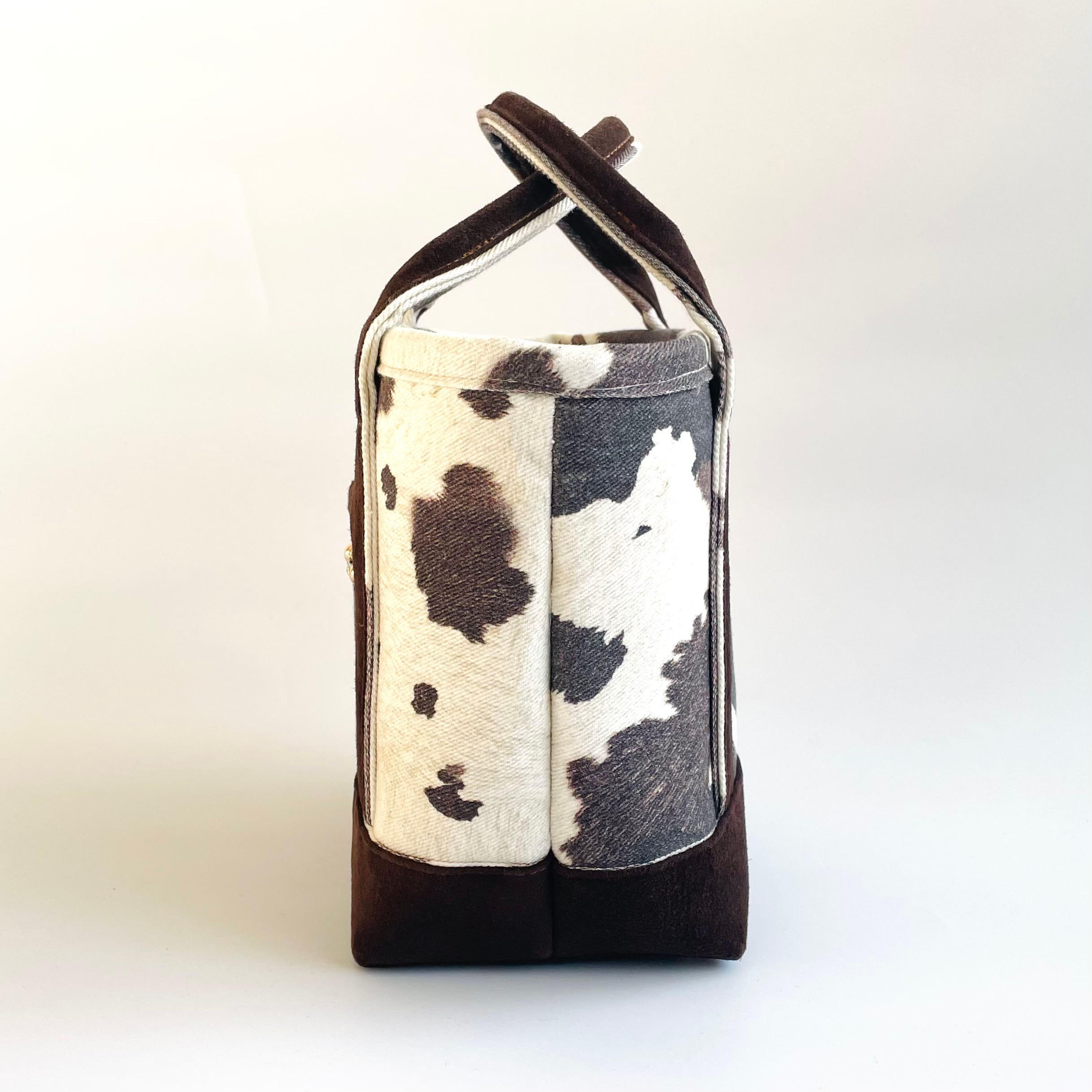 An eye-catching mini tote bag combining denim fabric with a cow-pattern design.