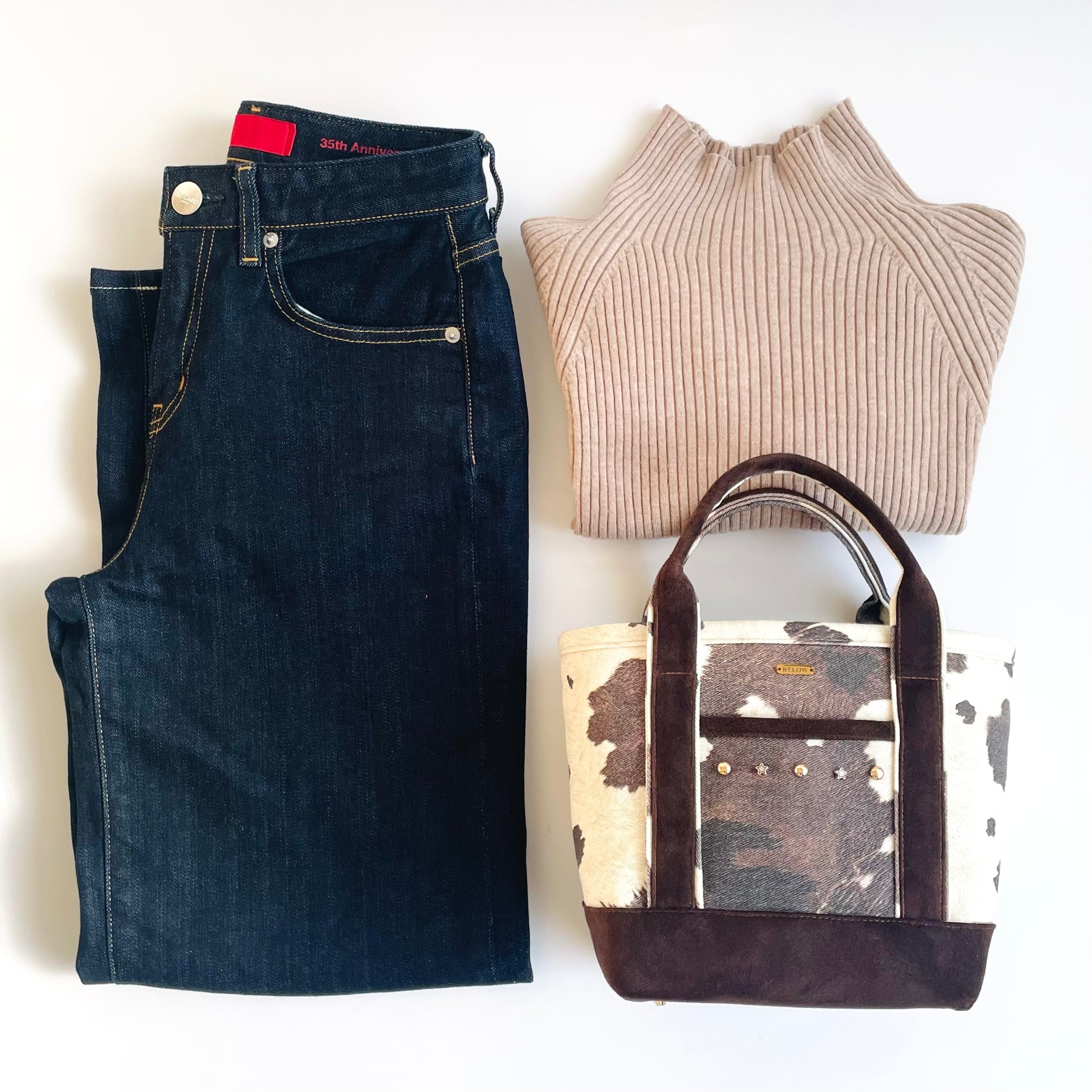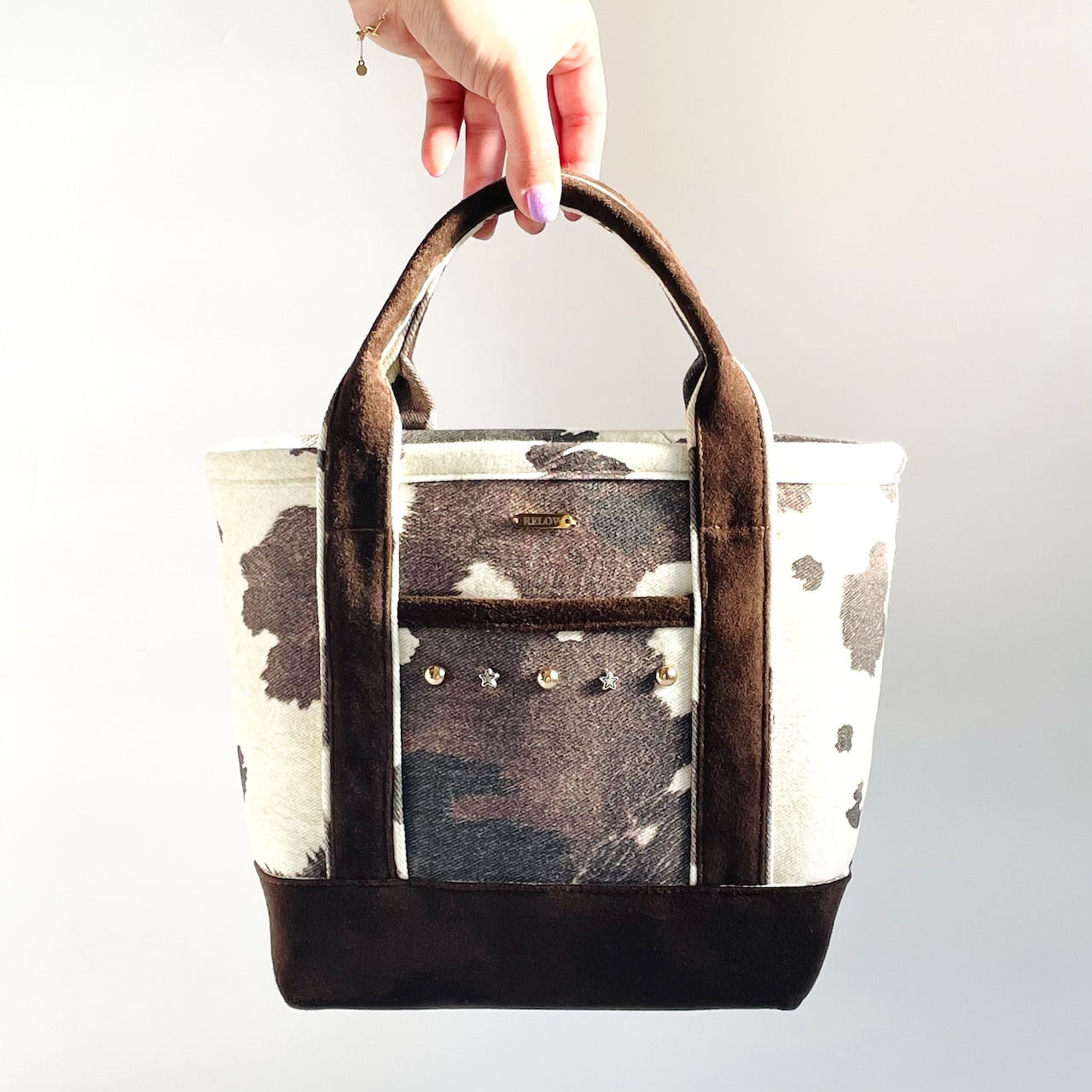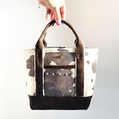デニム素材に牛柄を組み合わせた、印象的なミニトートバッグ。